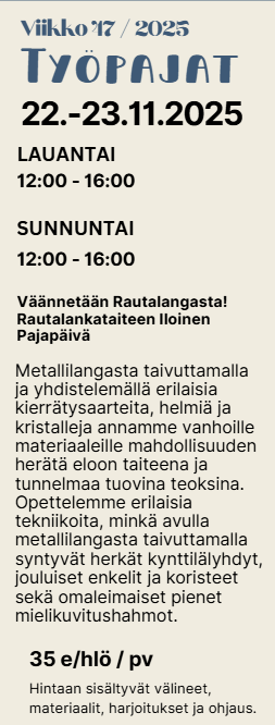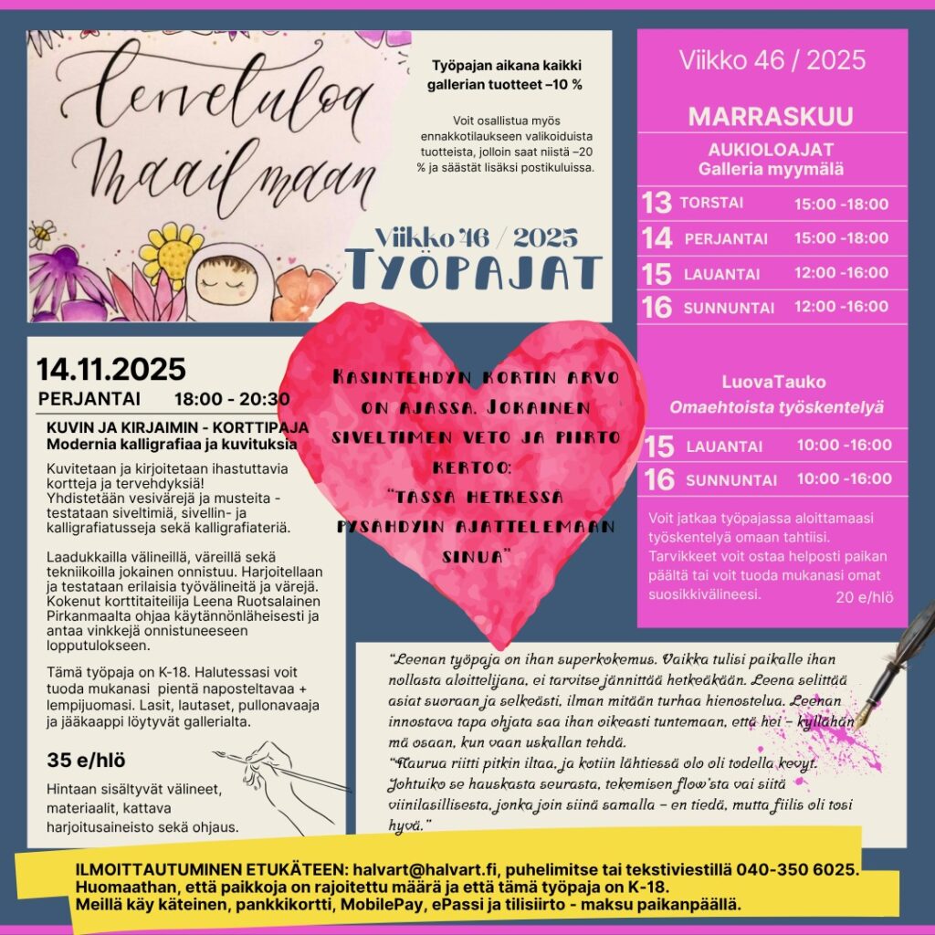 Osallistujille myös kaikista gallerian tuotteista -10% koko työpajan ajan.